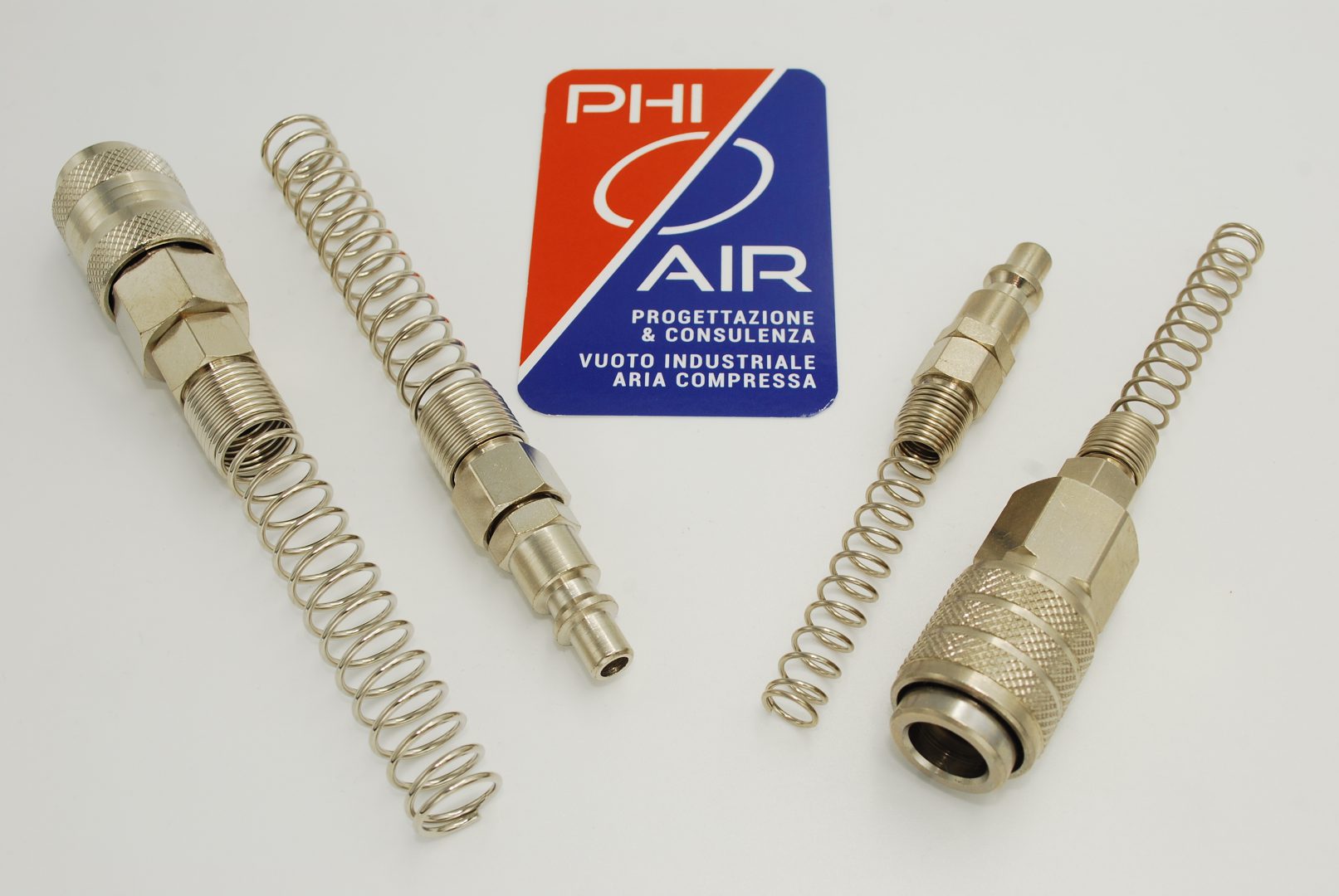 Raccordi Automatici con molla per tubo calibrato, maschio e femmina per connessioni rapide. La femmina è dotata di valvola di arresto. Solitamente utilizzati per connessione di utensili e/o pistole agli impianti pneumatici.