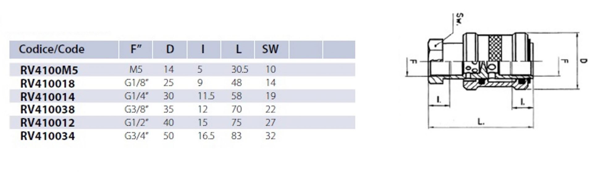 Materiali: Corpo Ottone Nichelato e/o Resina Acetalica; O-Ring: NBR